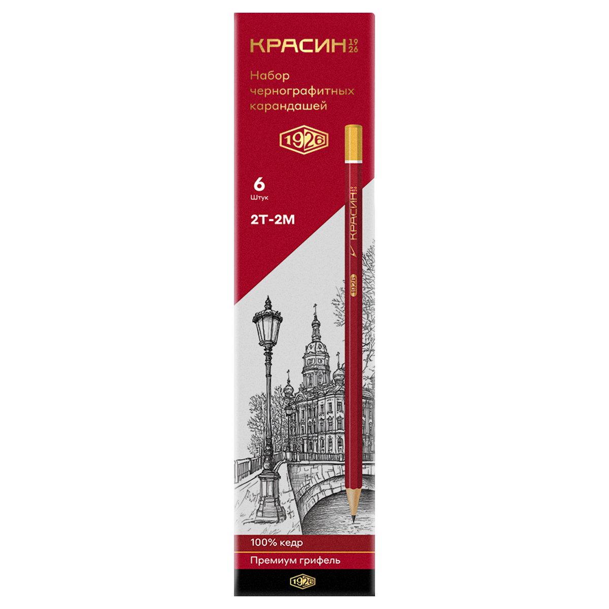 Изысканный винный красный цвет в сочетании с золотым тиснением придает карандашу благородный вид. Набор 2Т(Н)-2М(В) включает в себя основные твердости грифеля: 2Т, Т, ТМ, М, 2М. Это оптимальный набор для создания качественного рисунка или чертежа. Карандаши поставляются заточенными, упакованы в картонную коробку с европодвесом.