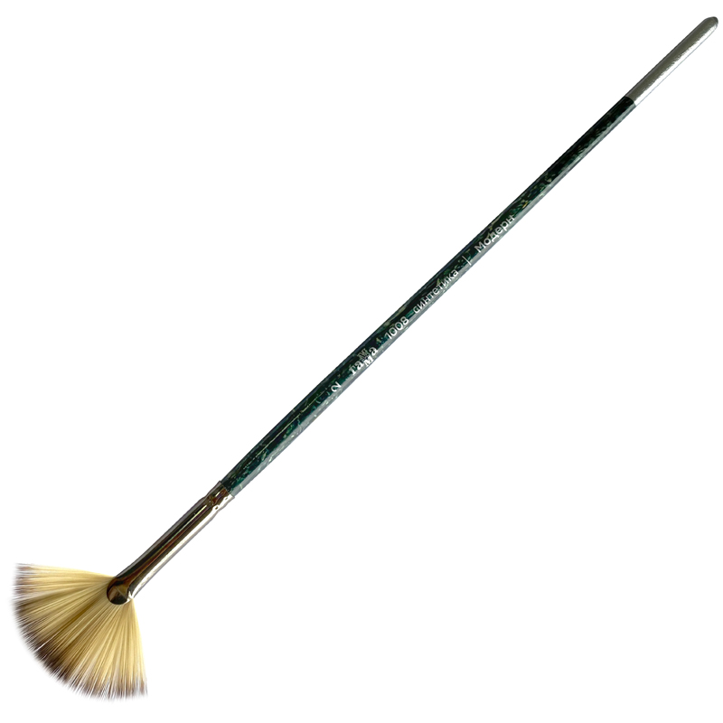 Главное отличие кистей серии – это упругий волос средней жесткости. Плотная набивка пучка и тонкая синтетическая нить дают идеальное сочетание для живописи. Кисть хорошо набирает краску, контролируемо её отдает, мягко отвечает на каждое движение художника. Кисти «Модерн» универсальны и подойдут для красок разной консистенции. Веерная кисть – разновидность плоской кисти, которая имеет негустой пучок ворса в виде веера. Она позволяет выполнить цветовую растяжку, смягчить контуры рисунка, растушевать уже нанесенную на основу краску.