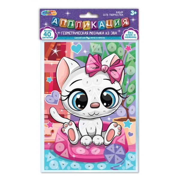 С помощью красочной картонной основы и разноцветных мягких элементов юная художница сможет самостоятельно создать необычную аппликацию с изображением милой белой кошечки с розовым бантиком. Готовую поделку можно подарить близким или использовать для украшения интерьера.