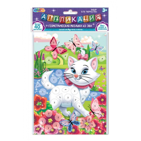 С помощью красочной картонной основы и разноцветных мягких элементов юная художница сможет самостоятельно создать необычную аппликацию с изображением очаровательной белоснежной кошечки. Готовую поделку можно подарить близким или использовать для украшения интерьера.