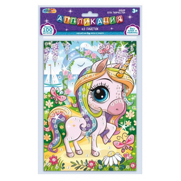 С помощью этого набора юный художник сможет самостоятельно создать сверкающую аппликацию с изображением милого единорога. Готовую поделку можно подарить близким или использовать для украшения интерьера.