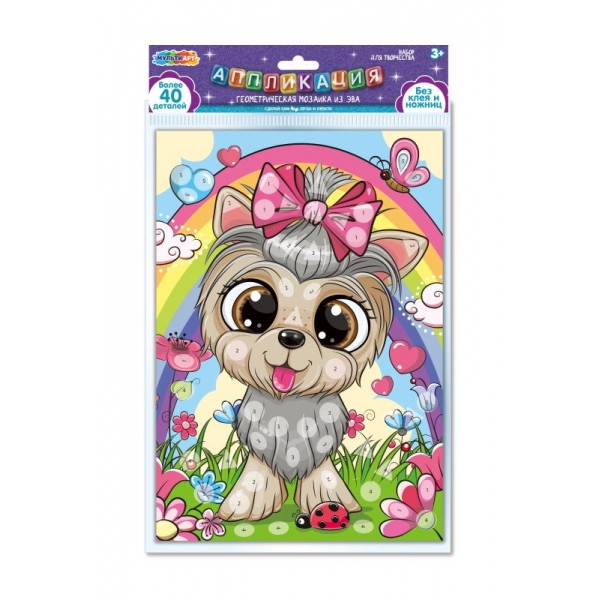 С помощью красочной картонной основы и разноцветных мягких элементов юная художница сможет самостоятельно создать необычную аппликацию с изображением очень милой собачки с бантиком. Готовую поделку можно подарить близким или использовать для украшения интерьера.