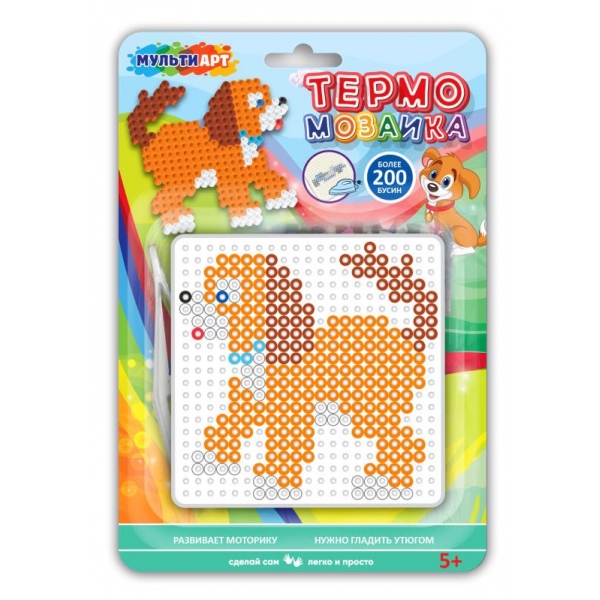 Из разноцветных бусин, входящих в данный набор, юный художник сможет собрать фигурку забавного пёсика. Чтобы зафиксировать рисунок, бусины нужно накрыть специальной пергаментной бумагой и прогладить нагретым утюгом. ВНИМАНИЕ: проглаживать поделку может только взрослый! Получившуюся фигурку можно будет использовать для дальнейшей игры.