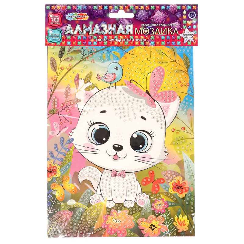 При помощи этого набора маленький художник сможет создать красивую блестящую открытку-мозаику, декорированную сверкающими стразами. Яркую поделку можно подарить близким или использовать для украшения комнаты.