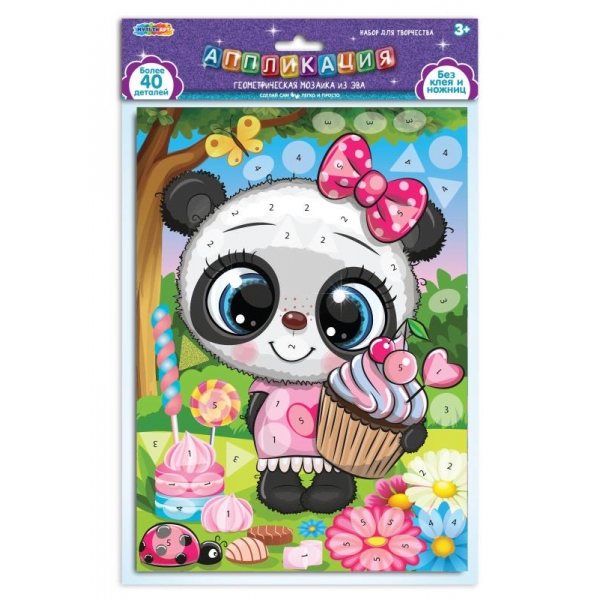 С помощью красочной картонной основы и разноцветных мягких элементов юная художница сможет самостоятельно создать необычную аппликацию с изображением милой большеглазой панды. Готовую поделку можно подарить близким или использовать для украшения интерьера.