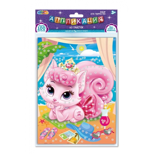 С помощью этого набора юный художник сможет самостоятельно создать сверкающую аппликацию с изображением в виде Бьюти - очаровательной розовой кошечки с короной - питомца принцессы Авроры. Готовую поделку можно подарить близким или использовать для украшения интерьера.