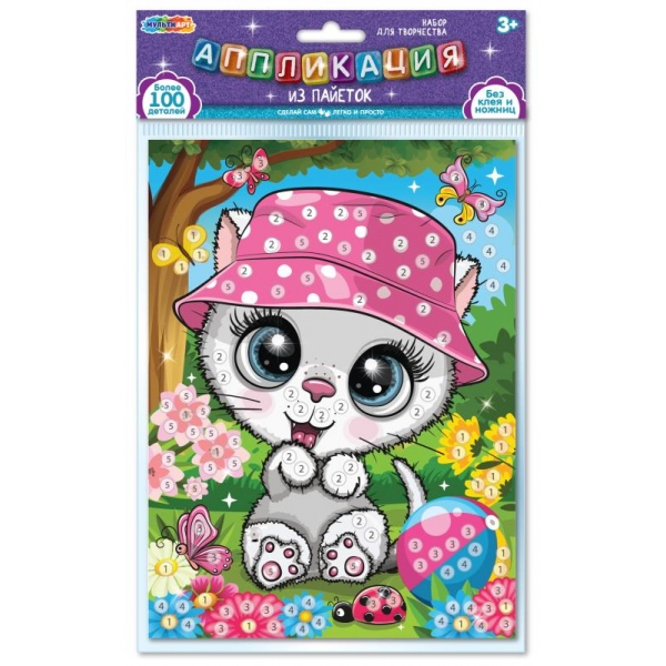 С помощью этого набора юный художник сможет самостоятельно создать сверкающую аппликацию с изображением милой кошечки в шляпке. Готовую поделку можно подарить близким или использовать для украшения интерьера.