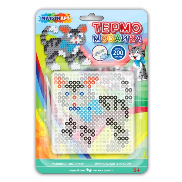 Из разноцветных бусин, входящих в данный набор, юный художник сможет собрать фигурку кошки с очаровательным бантом на шее. Чтобы зафиксировать рисунок, бусины нужно накрыть специальной пергаментной бумагой и прогладить нагретым утюгом. ВНИМАНИЕ: проглаживать поделку может только взрослый! Получившуюся фигурку можно будет использовать для дальнейшей игры.