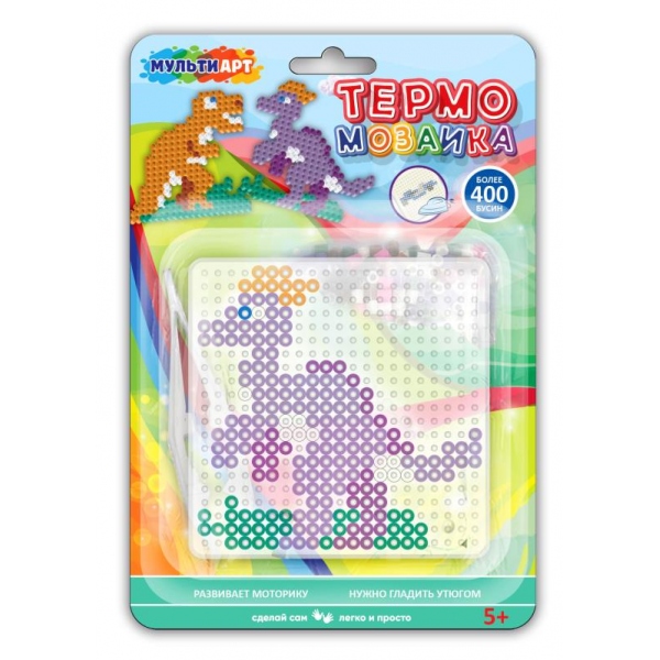 Из разноцветных бусин, входящих в данный набор, юный художник сможет собрать 2 фигурки динозавров. Чтобы зафиксировать рисунок, бусины нужно накрыть специальной пергаментной бумагой и прогладить нагретым утюгом. ВНИМАНИЕ: проглаживать поделку может только взрослый! Получившиеся фигурки можно будет использовать для дальнейшей игры.