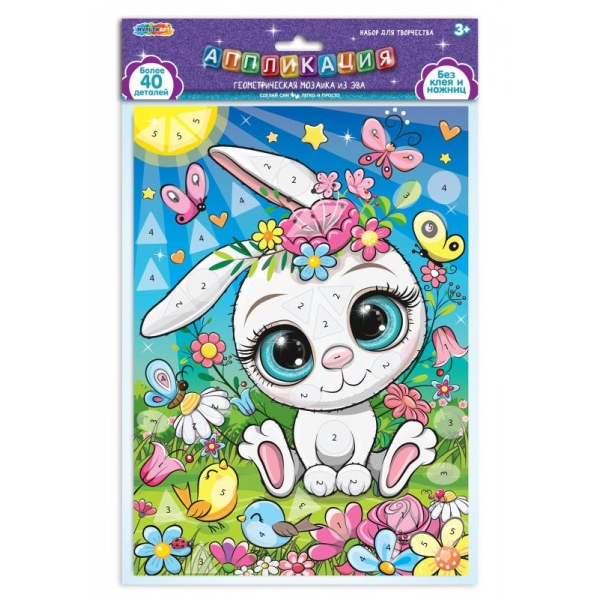 С помощью красочной картонной основы и разноцветных мягких элементов юная художница сможет самостоятельно создать необычную аппликацию с изображением милого большеглазого зайчика на цветочной поляне. Готовую поделку можно подарить близким или использовать для украшения интерьера.